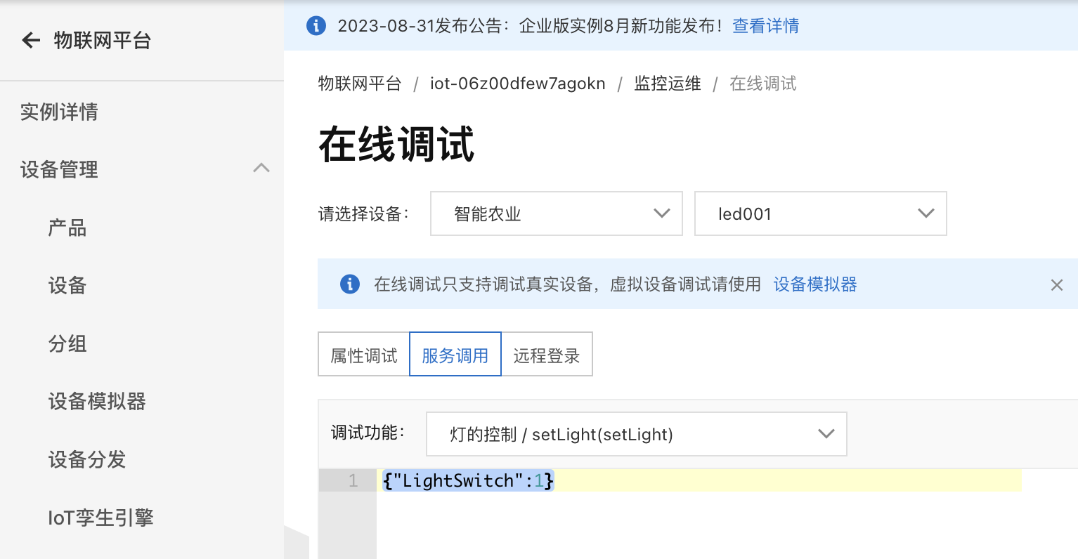 // {"method":"thing.service.property.set","id":"282860794","params":{"LightSwitch":1},"version":"1.0.0"}