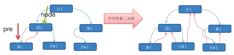 将上图的二叉树,进行 中序线索二叉树, 先中序遍历的数列为 8,3,10,1,14,6。